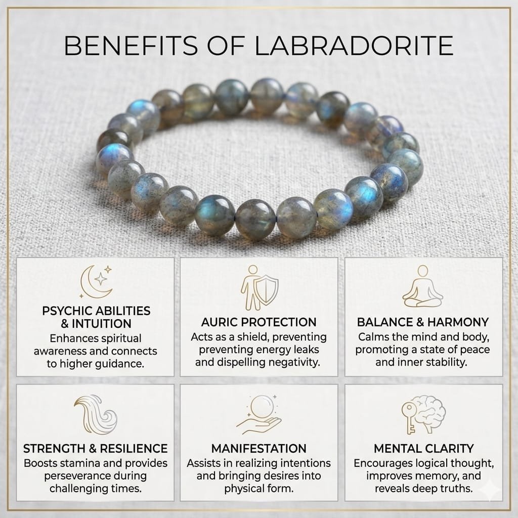 Labradorite Crystal Bracelet is a powerful mystical stone known for protection and transformation. It creates a shield against negative energies and enhances intuition.