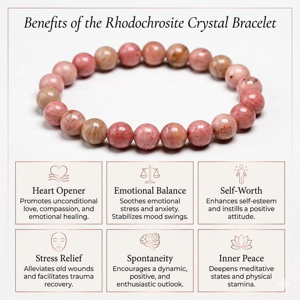 The Rhodochrosite Crystal Bracelet is a stone of compassion, emotional balance, and love. Known as the “Rescue Stone,” it helps heal emotional wounds, release past traumas, and open the heart to forgiveness and harmony. Rhodonite nurtures feelings of self-worth and encourages you to embrace unconditional love — for yourself and others. It balances the Heart Chakra, promoting emotional clarity, calmness, and understanding in relationships. This crystal is also believed to transform negative emotions like anger, jealousy, or resentment into positive energy and inner peace. Ideal for those seeking healing from heartbreak or emotional stress, the Rhodochrosite Bracelet restores confidence, compassion, and emotional strength.